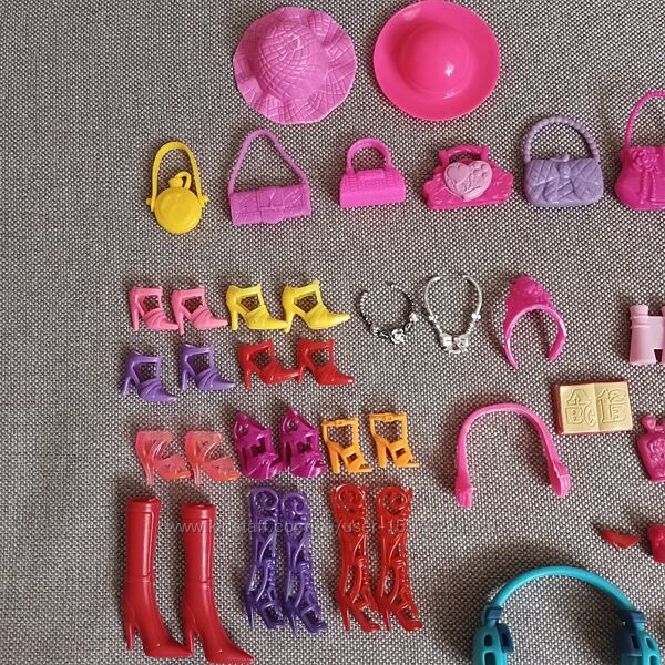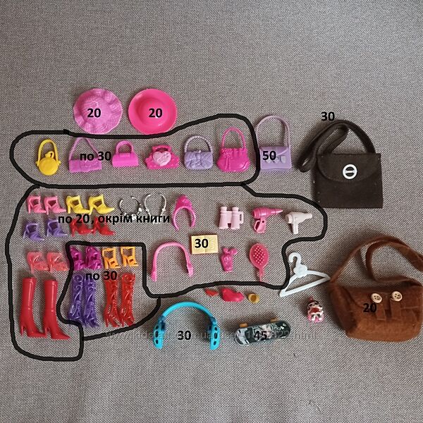 Аксесуари для ляльок типу Барбі і не тільки.Взуття, капелюхи, намисто, корона, гребенці, картина, бінокль, скейт, книжка, фен та інше.