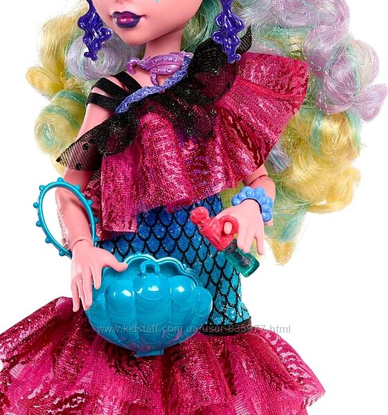 Лялька Lagoona Blue прибуває на бал монстрів у шикарному стилі! Вона влаштовує вечірку, яка неодмінно заявить про себе на жахливому танцювальному майданчику Monster HighМорська сукня цього морського чудовиська має лускатий ліф! Прозорі оборки з кораловими деталями на вирізі горловини та подолу надають неймовірно гламурної естетики