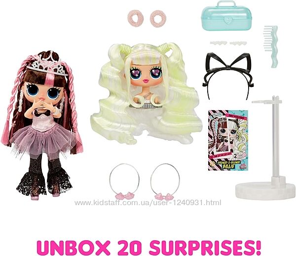 ПРЕДСТАВЛЯЄМО абсолютно нову ляльку LOL Surprise Tweens Surprise Swap Fashion Doll Bronze-2-Blonde Billie, яка поставляється з 2 унікальними образами та змінною голівкою для укладки для максимального налаштування та гри з зачіскою!ФУНКЦІЯ ЗМІНИ ГОЛОВИ Змініть вигляд Біллі миттєво, замінивши її коричнево-рожеву зачіску на укладальну голову зі світлими відблисками, які можна легко прикріпити до тіла ляльки. Далі швидко переодягніть їй наряд і замініть аксесуари, зокрема головний убір, аксесуари для волосся тощо!
