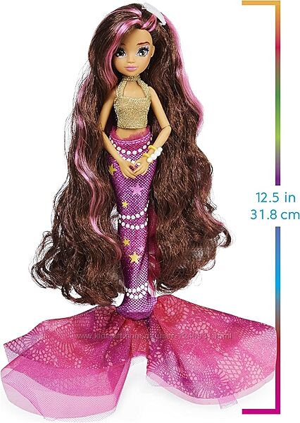 МОДНА ІГРАШКА РУСАЛКА ДЕЛЮКС: Searra сплескує модою! Ця деталізована 10,5-дюймова фігурка ляльки-русалки включає хвіст із високоякісної тканини, блискучий топ, спідницю, гольфи, взуття та 6 аксесуарів!ЗНІМНИЙ ХВІСТ РУСАЛКИ ДЛЯ ГРИ 2-В-1: чудовий плавник Сірри з блискучим мереживом і воланами гармонійно поєднується з її чарівною індивідуальністю. Перевдягайте її в одяг і взуття для ляльки, щоб одягатися та грати з цією іграшкою для дівчаток!