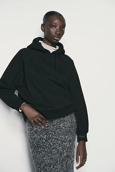 Худи со смешанной хлопковой ткани с длинными рукавами. Шнурки для регулировки на капюшоне и эластичная окантовка в рубчик по краям.