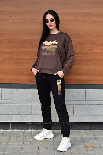 Верх костюма – вільний світшот зі спущеною лінією плеча та класичною круглою горловиною. Штани з манжетами внизу забезпечують неперевершений комфорт та надають образу сучасного шарму.