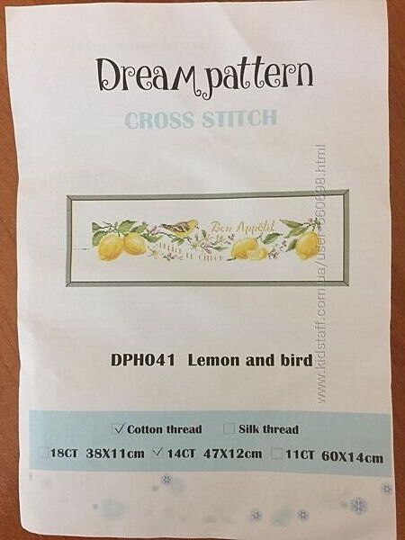 Набір для вишивки Лимони та пташка Продам набір для вишивки (Китай) канва білого кольору , 14 кт відкривався дляознайомлення вся комплектація на місця Схема кольорова символьна Китай