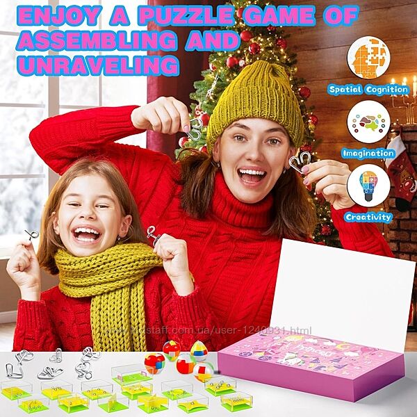 Захоплююче завдання: вирушайте в захоплюючу пригоду розгадування головоломок із нашим різдвяним адвент-календарем. Розв’яжіть 6 пластикових головоломок (пластмаса сертифікована ROHS із захисту навколишнього середовища), подолайте 6 випробувань на металевому дроті та керуйте 12 унікальними іграшками для балансування. Досліджуйте різноманітні техніки та занурюйтеся в гострі відчуття розгадування головоломокНесподіваний зворотний відлік: відчуйте хвилювання 24-денного зворотного відліку до Різдва з новою веселою головоломкою або балансуючим лабіринтом, які потрібно розгадувати щодня. Відкрийте таємниці цих захоплюючих головоломок і насолодіться сюрпризами, які вони містять
