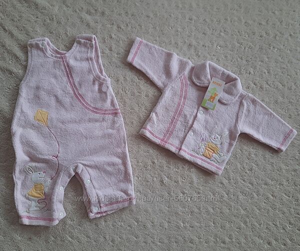 В комплект входит удобный полукомбинезон на кнопках на ножках и на плечах и кофточка на кнопочках.