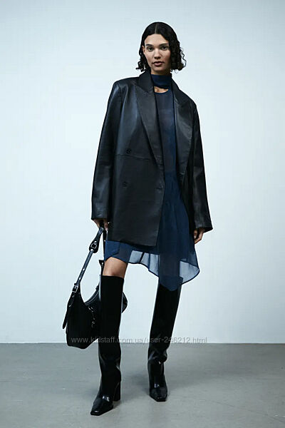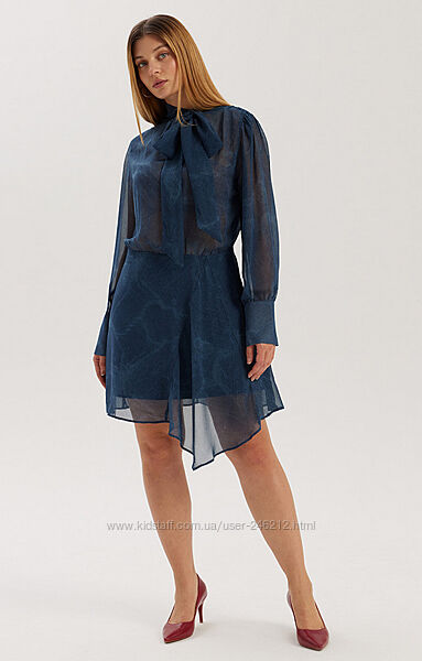 Довгі рукави з широкими манжетами на ґудзиках, прилаштована талія та асиметричний поділ.