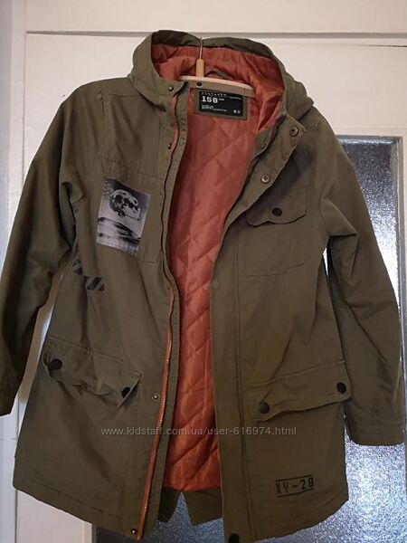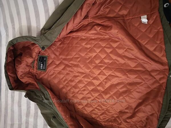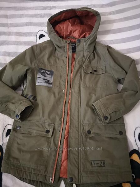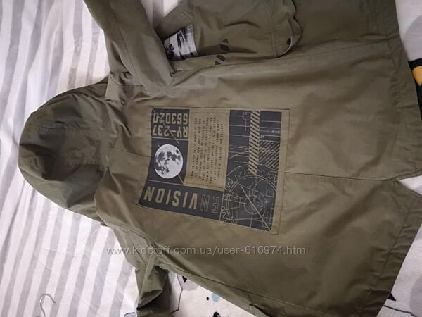 Продаю куртку-вітровку, р. 158, RESERVED, колір темний хакі. Вона на тоненькому утеплювачі, дуже зручна, функціональна, не продувається, прикрашена спереду і на спині стильними наліпками. Виглядає чудово, все працює, нема ніяких нюансів.