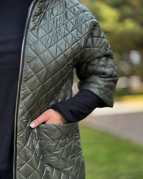Подовжене пальто на синтепоні, рукав нижче ліктя( довжина 3/4), застібається на застібку з двома бігунками, з боків глибокі кишені, комір-стійка, підійде під брюки, сукню, костюм, спідницю; взуття спорт або класика.