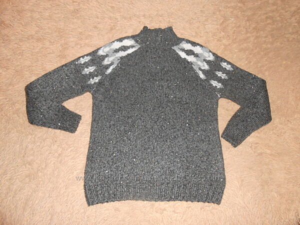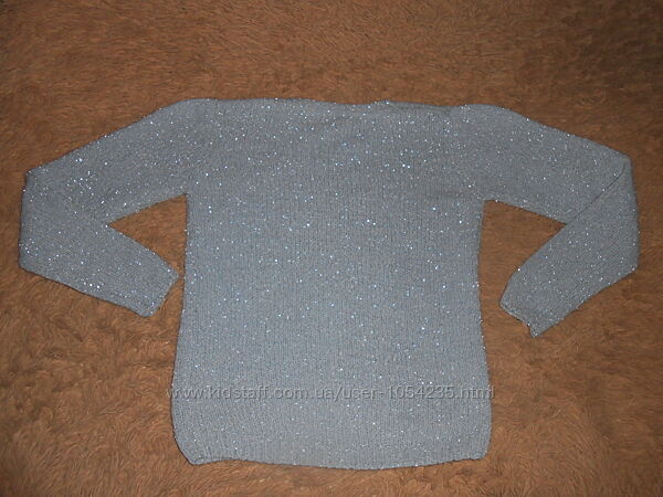 2. Свитерок серый с блестинками на рост 158-164 см., на возраст 13-14 лет "George": длина рукава вместе с плечиком - 67 см.,ширина под рукавчиками - 46 см., длина от плечика - 59 см. По всему свитеру, впереди и сзади бусинки и пайетки. Свитер плотный и теплый. Материал: 53% полиэстер, 44% акрилик, 3% полиамид. Цена: 100 грн.