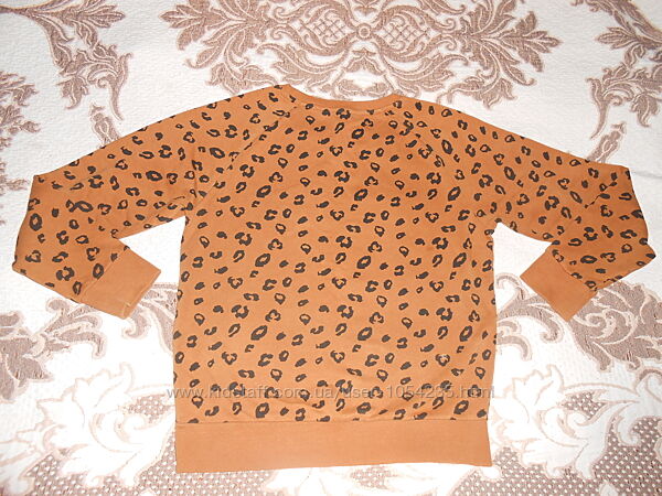 4. Свитерок леопардовый с сердцем на рост 164 см., на возраст 14 лет "Next": длина рукава вместе с плечиком - 64,5 см., ширина под рукавчиками - 48,5 см., длина от плечика - 58 см. Горловинка, низ рукавчиков и свитерка на широкой резиночке, впереди блестящая аппликация из пайеток (пайетки двусторонние: с одной стороны сердечко белое, с другой - черное), внутри свитерка небольшой начесик. Материал: 80% хлопок, 20% полиэстер. Цена: 90 грн.