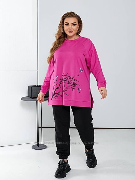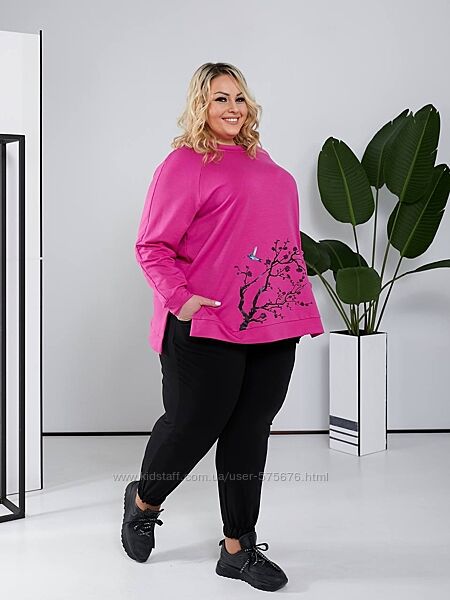 тканина еластична, тому штани 64-66 сядуть на ос до 155 см , кофта з розрізом по боках , тому буде зручно.