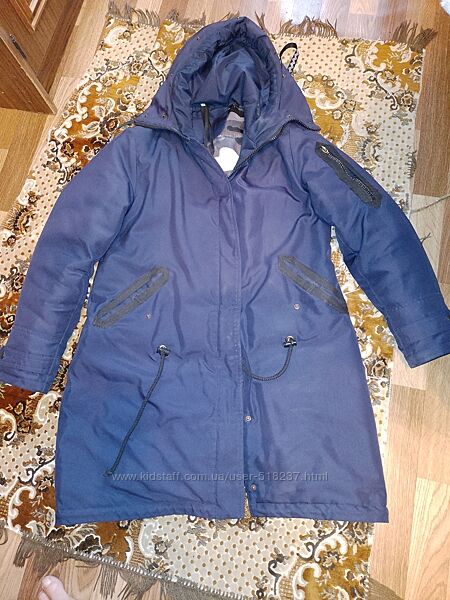 Куртка темно синяя до колена, наполнитель холлофайбер, легкая, теплая, с капюшоном ПОГ 58, ПОБ 63, Длина 91, Ширина плеч 46, Длина рукава 63 смЗмейка нерабочая, застёжка на кнопках