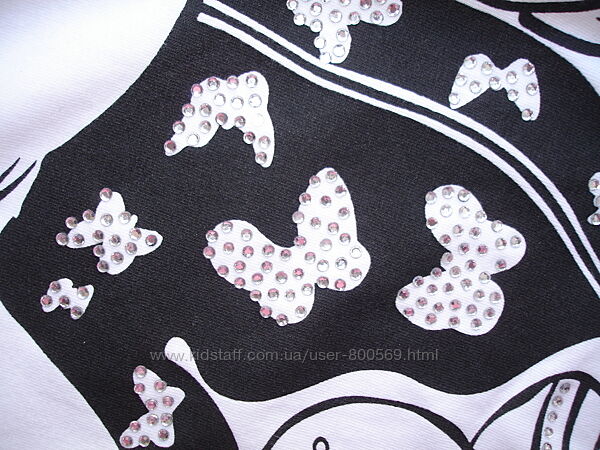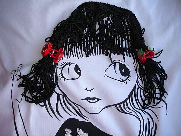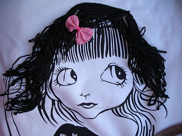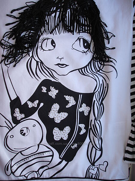 Удлиненная модель. Впереди на тунике принт милой девчонки, волосы которой изготовлены из бахромы, при помощи которой ваш ребенок может сделать ей любую прическу( хвостики, косички, заколоть челочку). Также на передней части изделия есть бабочки, декорированные серебристыми стразами, нежно мерцающими на свету.