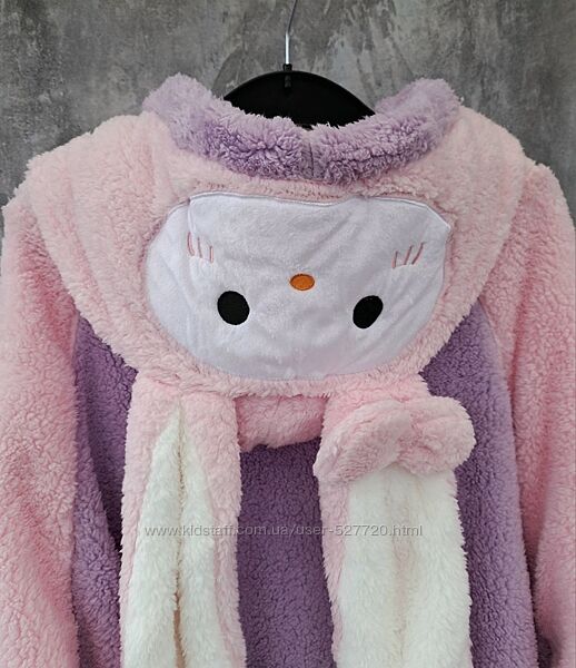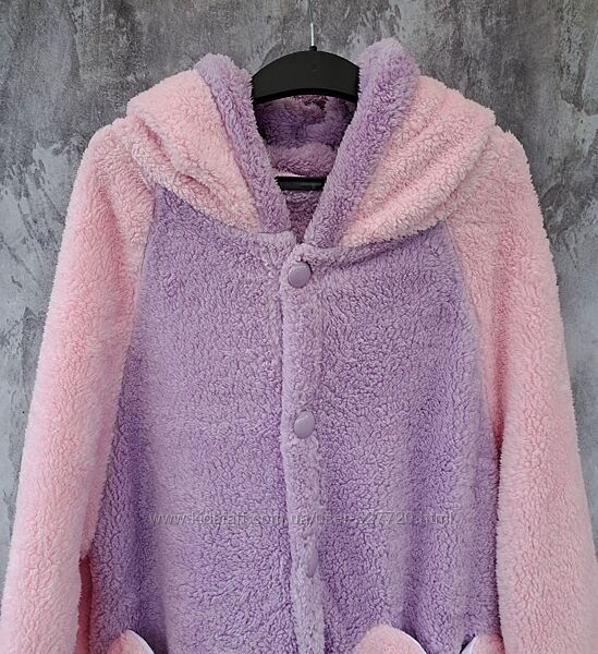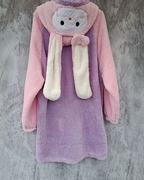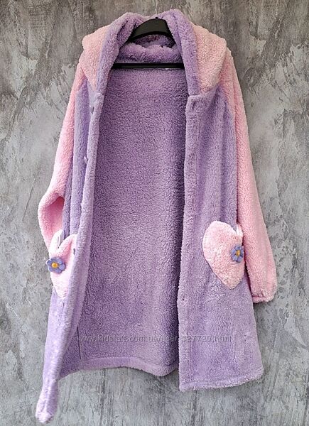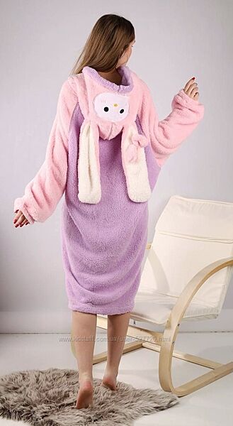 Женский теплый халат с капюшоном с ушками. Модель прямого кроя, застегивается на пуговицы, имеются накладные карманы в виде сердечек.Рукав-реглан, внизу присборен резинкой.