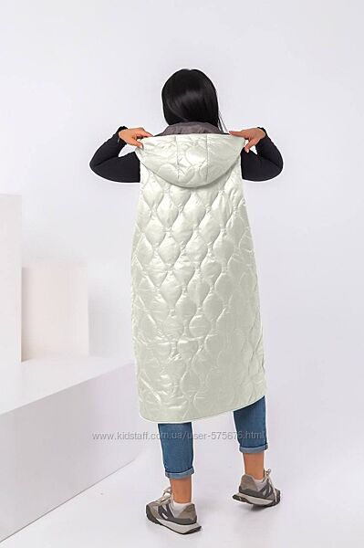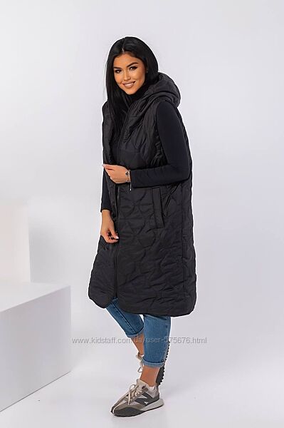 Подовжений жилет з капюшоном, на блискавці та двома кишенями, незамінний на цю пору року.Утеплений синтепоном 150.