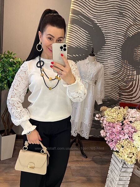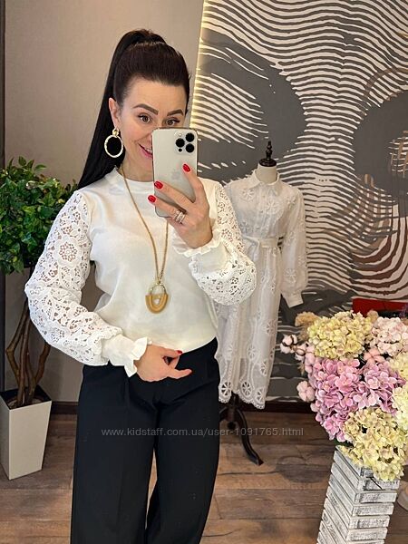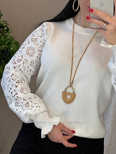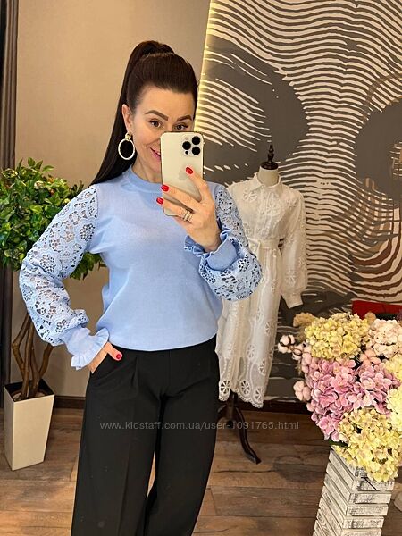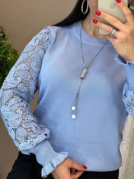 яскрава, стильна і комфортна кофта вільного крою з круглим коміром, на гумці внизу і високих манжетах, шикарними рукавами з приголомшливо гарного мережива на підкладці з прозорої сітки, виготовлена з приємного до тіла трикотажу дрібної машинної в´язкикофточка має чудовий вигляд на дівчатах з різними типами фігури, в ній затишно і легко, вона створить чудовий настрій і займе гідне місце у вашому гардеробі
