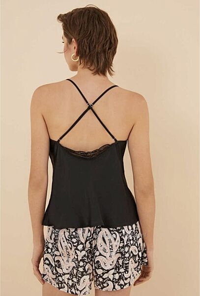 Коротка піжама на бретелях з м´якої атласної шовковистої тканини з мереживними деталями. Ідеально підходить для особливих вечорів.