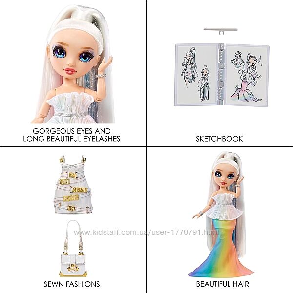Amaya Rain - у лялька плаття забарвлене в райдужний градієнт, два срібних браслета, в комплекті йде біла сумка і біле плаття з золотими вставками, туфлі білі з райдужним ремінцем. Підставка з гребінцем білі.