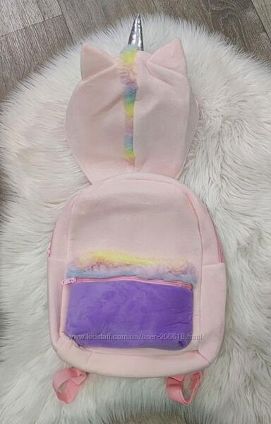 Суперовий плюшевий рюкзак Matalan (Англія) для дівчаток 💕 велике відділення на блискавці, а також передня кишеня на блискавці і з обробкою зі штучного хутра💕в комплекті йде капюшон, який надійно фіксується за допомогою липучки з 3D срібним рогом 🦄Розміри: В 35 см x Ш 25 см x Г 9,5 см