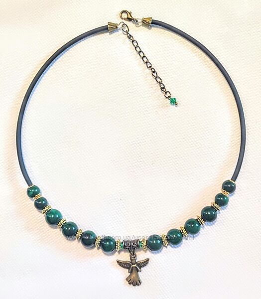 Кольє "Ангел" Малахіт" зібране з намистин темно-зеленого пресованого малахіту, металевої фурнітури кольору "бронза" і "античне золото", а також чорного каучукового шнура, надітого на основу з меморі-дроту. Довжина кольє - 44 см плюс 6 см подовжувальний ланцюжок. Кольє пасує до вишиванки і до іншого вбрання на Ваш смак.Прикраса зібрана в єдиному екземплярі. Передоплата на карту Приват банку. Доставка Новою поштою або Укрпоштою за рахунок покупця.