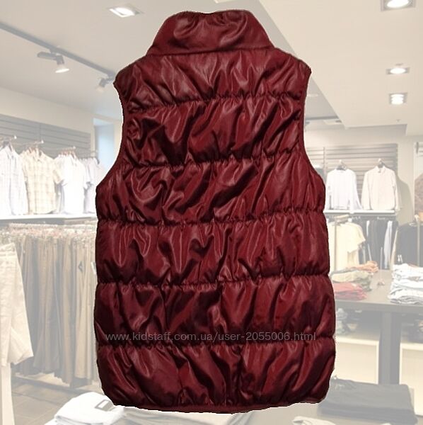 Дуже гарний легкий жилет, бордового кольору. Комірець – стійка, має дві зовнішніх кишені. Наповнювач - поліестер.Стан ідеальний.