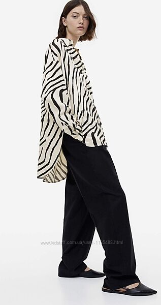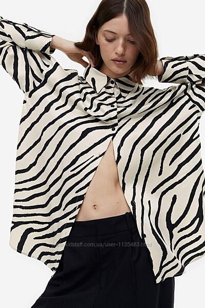 Блуза/рубашка H&M р. М/38/10-подойдет L/40/12.Блуза оверсайз из мягко ниспадающего вискозного атласа с воротником и планкой на пуговицах. Двухслойная кокетка сзади, заниженная линия плеча и длинные рукава с манжетами на пуговицах. Закругленный низ,