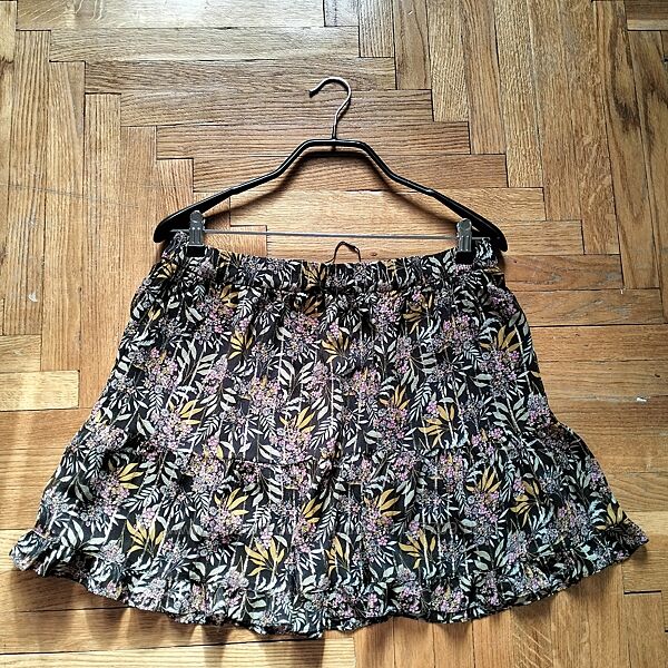 Крута спідниця Zara. Розмір вказаний XL підійде на L також. Спідниця має зручний широкий пояс, зручно носити на бедрах, ширина 80-85 см. Довжина 42 см. Матеріал : схожий на шифон чи препдишин. Спідниця не прозора, має чорну підкладку, на фото вказано.