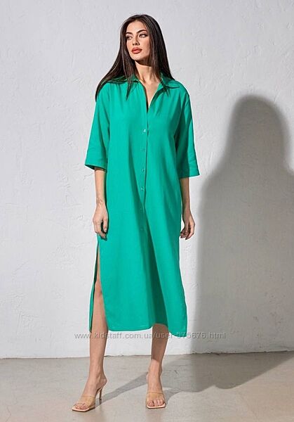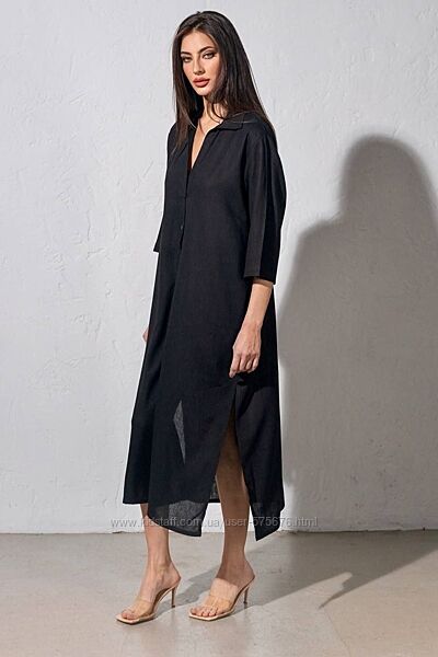 Довга сукня -сорочкана гудзиках та високими боковими розрізами. Модель з воротником.