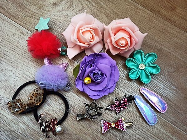 Набор резинок (фото 3-4) и заколок (фото 5-10). В очень хорошем состоянии. Каждую из них одевали по несколько раз. Все заколки и резинки очень красивые и эффектно смотрятся на волосах. Некоторые ручной работы.Резинки-розочки (фото 3) очень нежные и красивые, можно в школу.