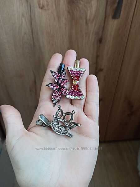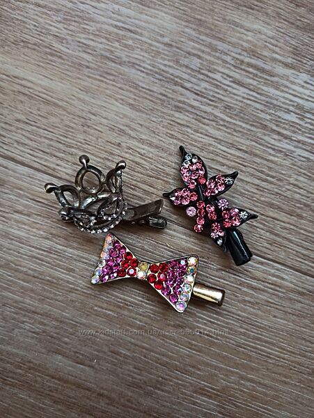 Фото 8-9 - заколка-цветок очень красивая, камни переливаются. Заколка-бантик тоже классная, одного камушка не хватает. Корона красивая, но трех камушков не хватает, в носке особо не видно. И металл немного потемнел, но все равно она классно смотрится.