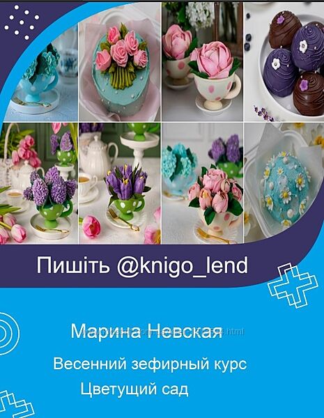 Зефир по заварной технологии «Лаванда с черничной начинкой» в темном шоколаде, украшенный цветами.Птичье молоко «Черная смородина-пломбир». Пирожные с весенним дизайном.Бенто-торты:Зефирный «Ромашки» (яблочно-лимонный зефир, лимонный бисквит, вишневая начинка)Зефирный «Розы»Птичье молоко «Тюльпаны» (ягодный зефир, кофейный бисквит, ягодная начинка)Птичье молоко «Ландыши» (ванильный бисквит, легкое суфле маракуйя-малина)Зефирные цветы насадкой:Чайные розыГортензииСиреньЗефирные торты:Пенек с цветамиШоколадная чашка с гортензиямиШоколадная чашка с сиреньюФлакончик с духамиТорт «Птичье молоко» в виде шоколадной чашки с розамиУрок по фотоУрок по нейрографикеУрок по упаковкеБОНУС - полный сборник рецептов "Домашний зефир"