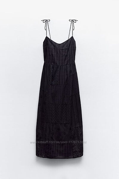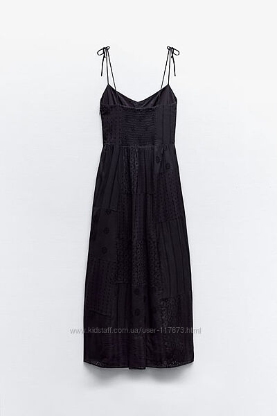 Сукня середньої довжини зі 100%-ї бавовни з прорізною вишивкою, V-подібним вирізом, тонкими зав’язуваними бретелями з тієї ж тканини, жатою еластичною тканиною ззаду та підкладкою. Застібаються на приховану блискавку збоку.Розмір Л