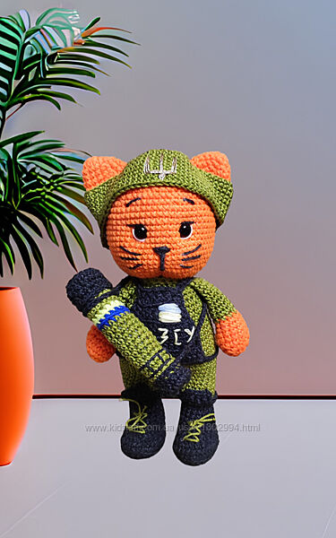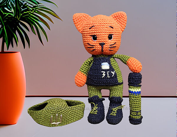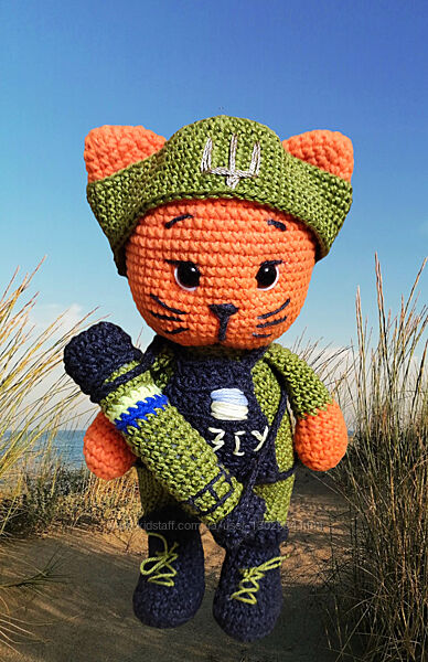 Бойовий котик ЗСУ. 24 см. Шапка і джавелін знімається.Котик ЗСУ, патріотичні іграшки в‘язані гачком, кіт, котик амігурумі, вязані іграшки, вязаний котик, військовий котик, м´які іграшки, іграшки ручної роботи.