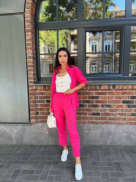 Стильний, яскравий та комфортний костюм трійка з легкої літньої тканини! В якому Ви будете просто наймовірно привабливі.Костюм складається з рубашки+брюк+майки.