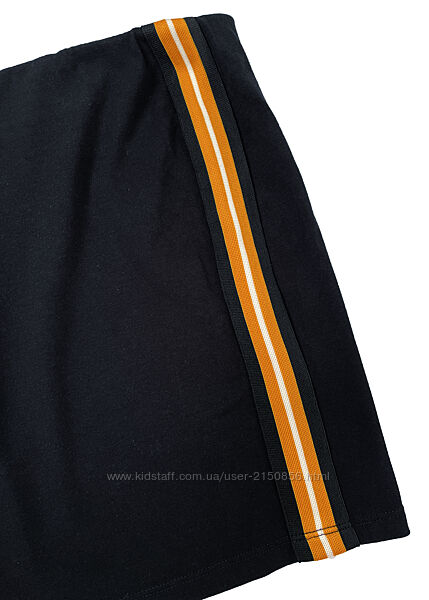 Оригінальна міні-спідниця в базовому чорному кольорі з жовтими смужками з боків від бренду New Look (лінія підліткового одягу Generation 915).Модель виконана з м´якої бавовняної трикотажної тканини (тканина тягнеться), пояс на широкій прихованій гумці.
