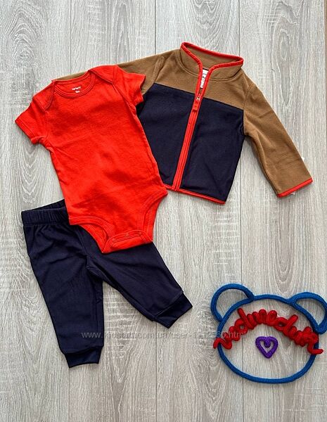 Костюм трійка для хлопчиків.Костюм складається з трьох речей: флісова кофточка на блискавці, боді з коротким рукавом та штани.