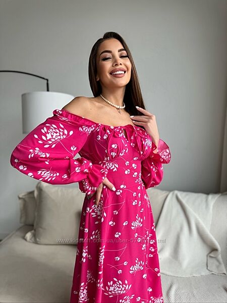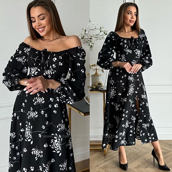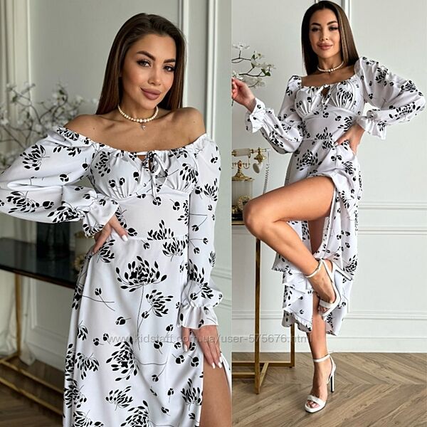 Ніжна і легка сукня з розрізом на нозі.Довжина міді, з відкритими плечима і ліхтарики рукавами.