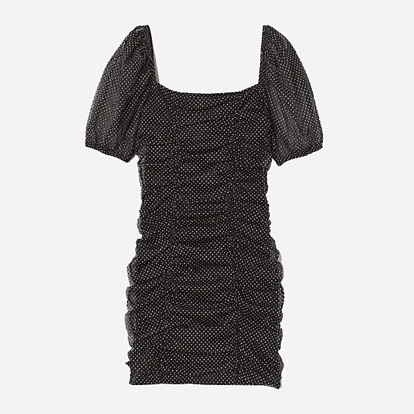 Коротка драпірована сукня з блискучої тканини з квадратним вирізом і короткими рукавами-ліхтариками із закритою гумкою на плечах і по нижньому краю. Підкладка із джерсі.Заміри: надаємо по запиту