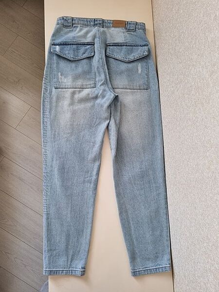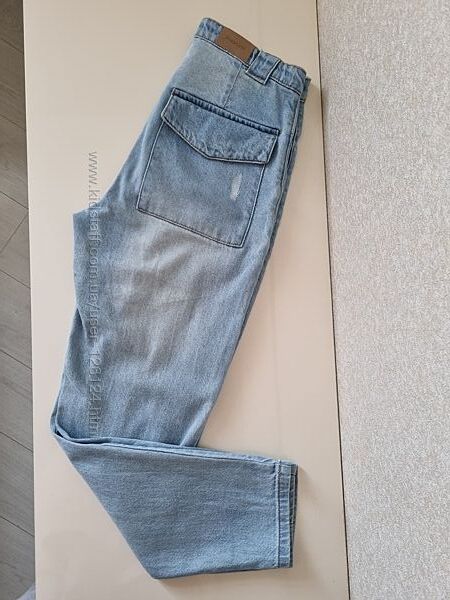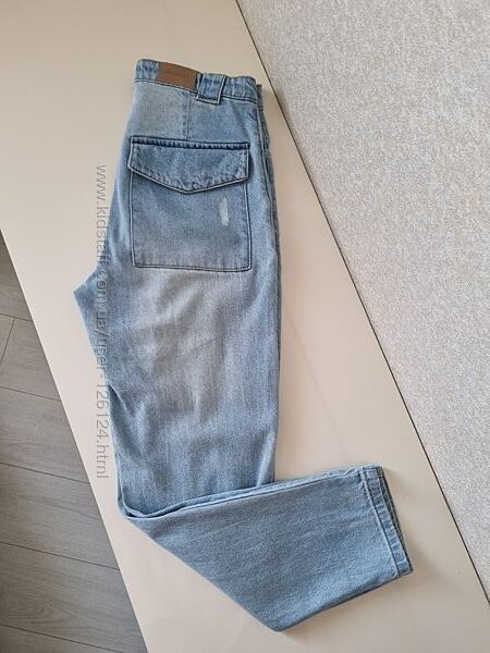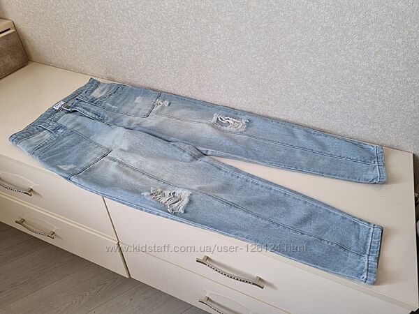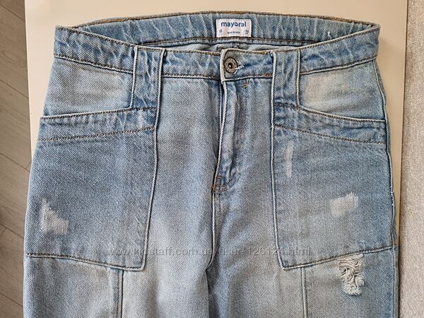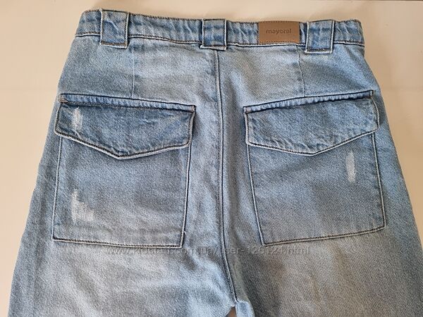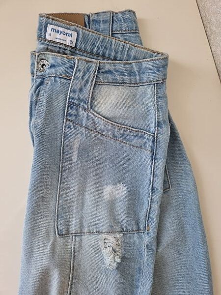 Круті блакитні джинси з м´якого коттону Mayoral на зріст 162 см, вік 14-16 років: ПОТ 36 см, ПОС 45 см, висота посадки 29 см, ширина штаньки вгорі ПО 29 см, довжина по боку 92 см, кроковий 66 смПосадка висока як мом-си, стильні потертості, ззаду кишені-клапани