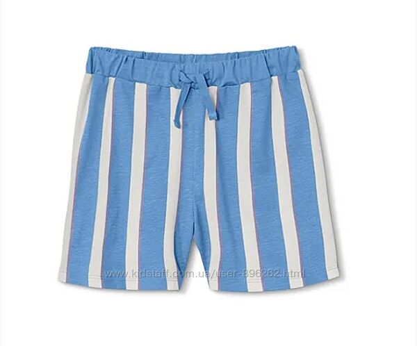 Короткі шорти. Шорти з м´якого однотонного трикотажу. Штани з внутрішньою регульованою гумкою та ремінцем на зав´язці. Штани з принтом в смужку. Сертифіковано GOTS.