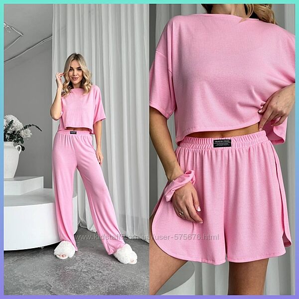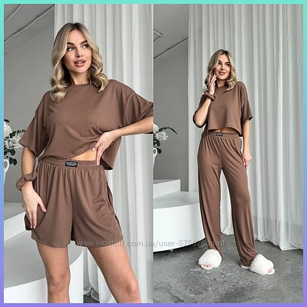 Подробное описание: 42-44, 46-48 7 кольорів костюм трійка футболка, шорти, штани трикотаж рубч