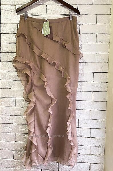 Обмена, возврата нет !Юбка длиной до щиколотки из нежной мятой ткани с воланами спереди и сзади. Потайная застежка-молния сзади и высокий разрез с одной стороны.