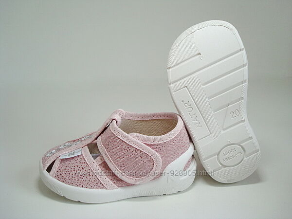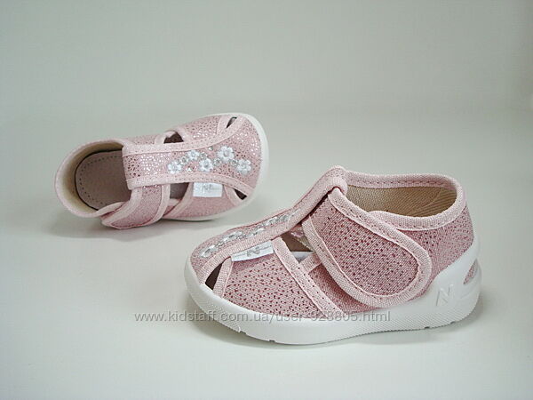 Гарні тапочки для найменших дівчаток Natur Waldi (Україна), рожевий колір з вкрапленнями блиску, носочок прикрашає вишивка квітів. Тапочки можна носити не лише з повсякденним одягом, а й зі святковими вбраннями. На ніжках вони виглядають дуже ніжно та витончено.