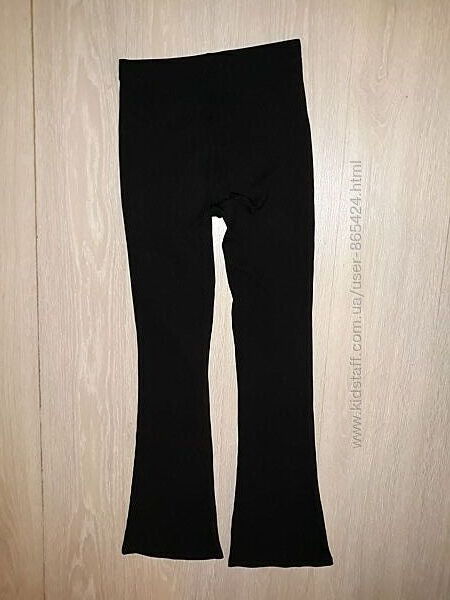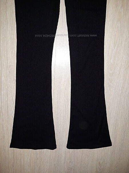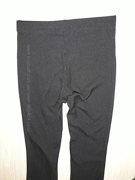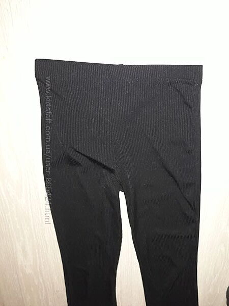 Фірмові, облягаючи легінси, лосини в рубчик з м´якого трикотажу На талії еластична вставка та краї розкльошені внизу. Склад 90% поліестерта 10% еластан. Стан відмінний
