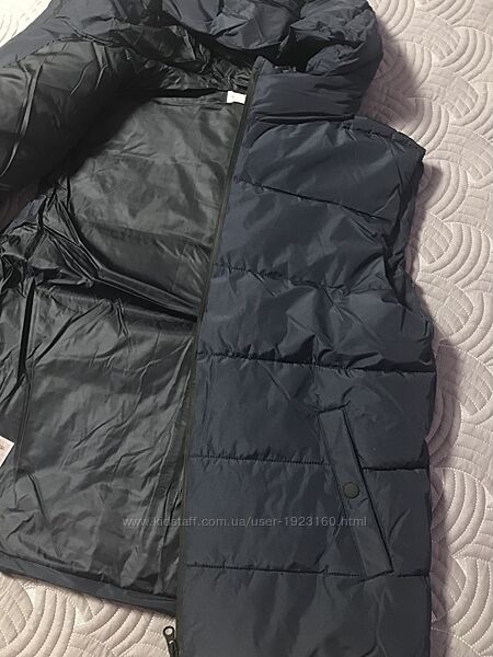 #mango Жилет Mango М´яка тканина. Прямий дизайн. Стандартний дизайн. Без рукавів. Закриття спереду. Застібка-блискавка. Капюшон. Дві бічні кишені. Розмір М Колір: темно синій; чорний