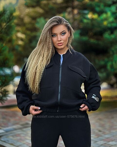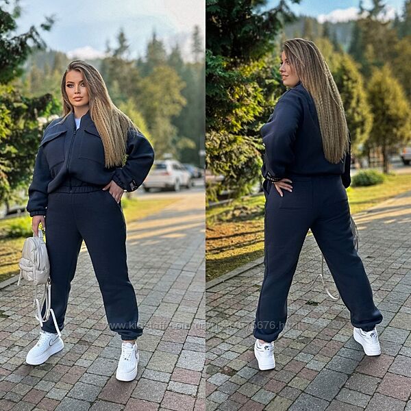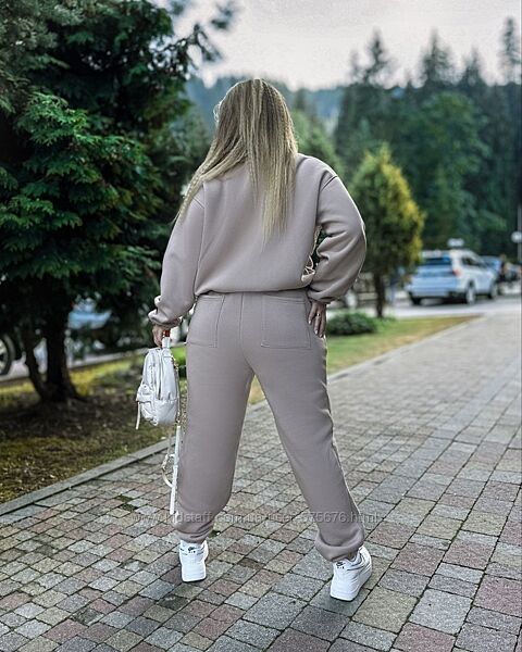Штани з високою посадкою, сзаду накладні кишені, також є кишені бокові. Пояс і манжети на резінці. Дуже якісний, теплий та гарний прогулянковий костюм.👍