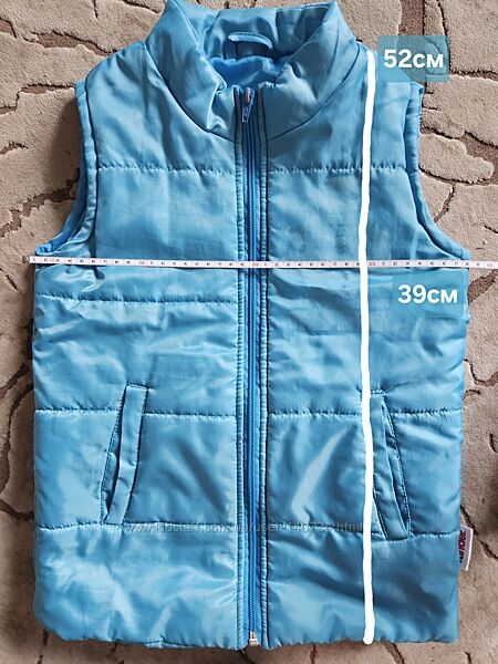 Тепла жилетка з кишенями у красивому блакитному кольорі. Стан: ідеальний, але лишилася висвітлена ділянка від принта. При бажанні можна нанести свій принт, або нашити накладну кишеню. Заміри на фото.