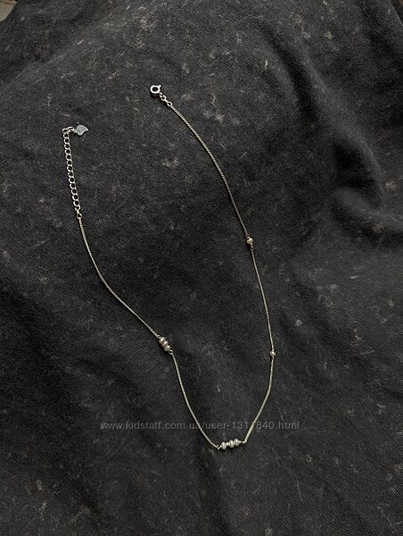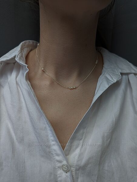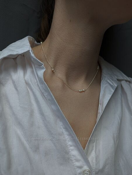Універсальна срібна прекраса на шию, яка підійде під будь-який стиль, настрій чи урочисту подію. Мінімалістичний чокер, який виконаний з срібла 925 проби. Основна довжина виробу 39 см + ланцюжок 4см для збільшення довжини.Має вставки з натуральних прісноводних перлинок. З однієї сторони йде по три перлинки і одна срібна бусинка, з іншої сторони по одній перлинці і також одна срібна бусинка. Перлинки мають форму рису (кожна перлинка має свою унікальну форму, яка була створена природою, але в цій прикрасі в основному використана форма рису), їх розмір 3мм.