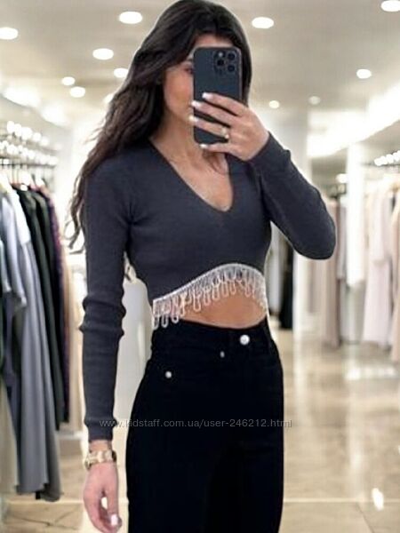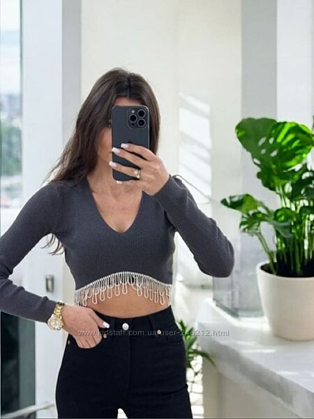 Укорочений топ із м´якої тканини.V-подібний виріз, довгі рукави, металева бахрома та обробка стразами по низу.