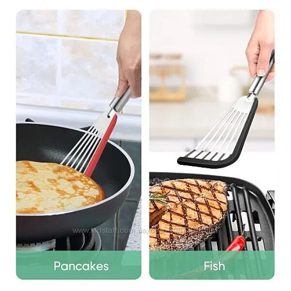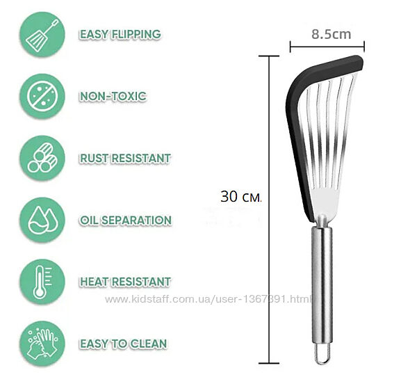 Широке застосування. Лопатка підходить для багатьох цілей, таких як перевертання яєць, млинців, риби, стейків, овочів тощо. Завдяки прорізам, та мінімальній товщині, дуже зручна в користуванні.